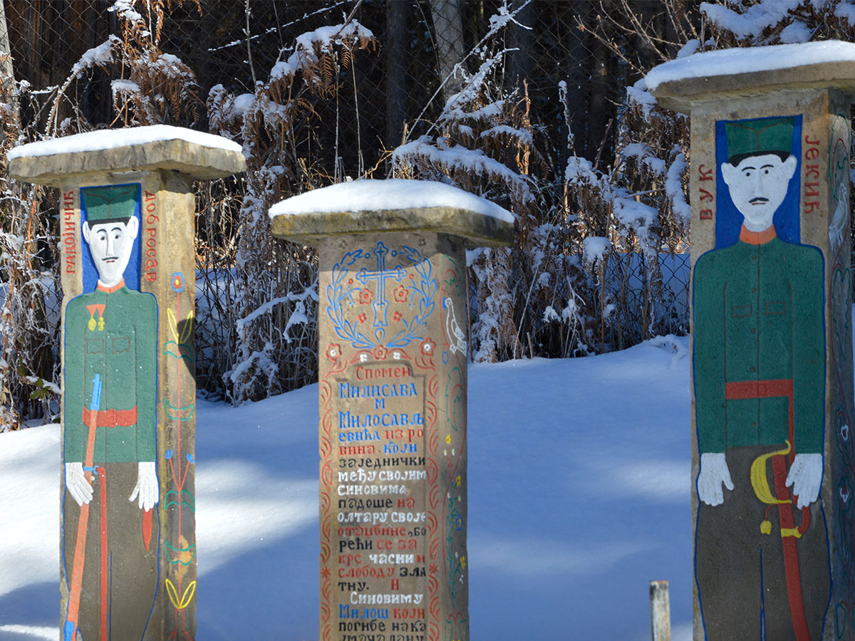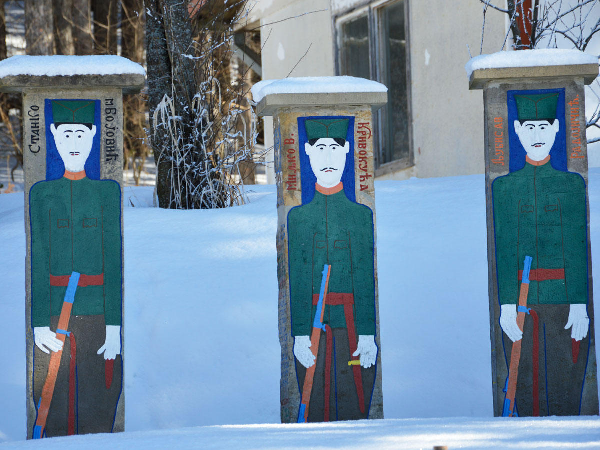 Skoro svi su isklesani u kamenu i na prednjoj strani imaju prikaz vojnika u stavu mirno, sa puškom i bajonetom. Svaki vojnik ima šajkaču i vojničko odelo, a neki vojnici na grudima imaju odlikovanja. Sa strane spomenika mogu se videte razni, dekorativni ornamenti, ali i epitafi.